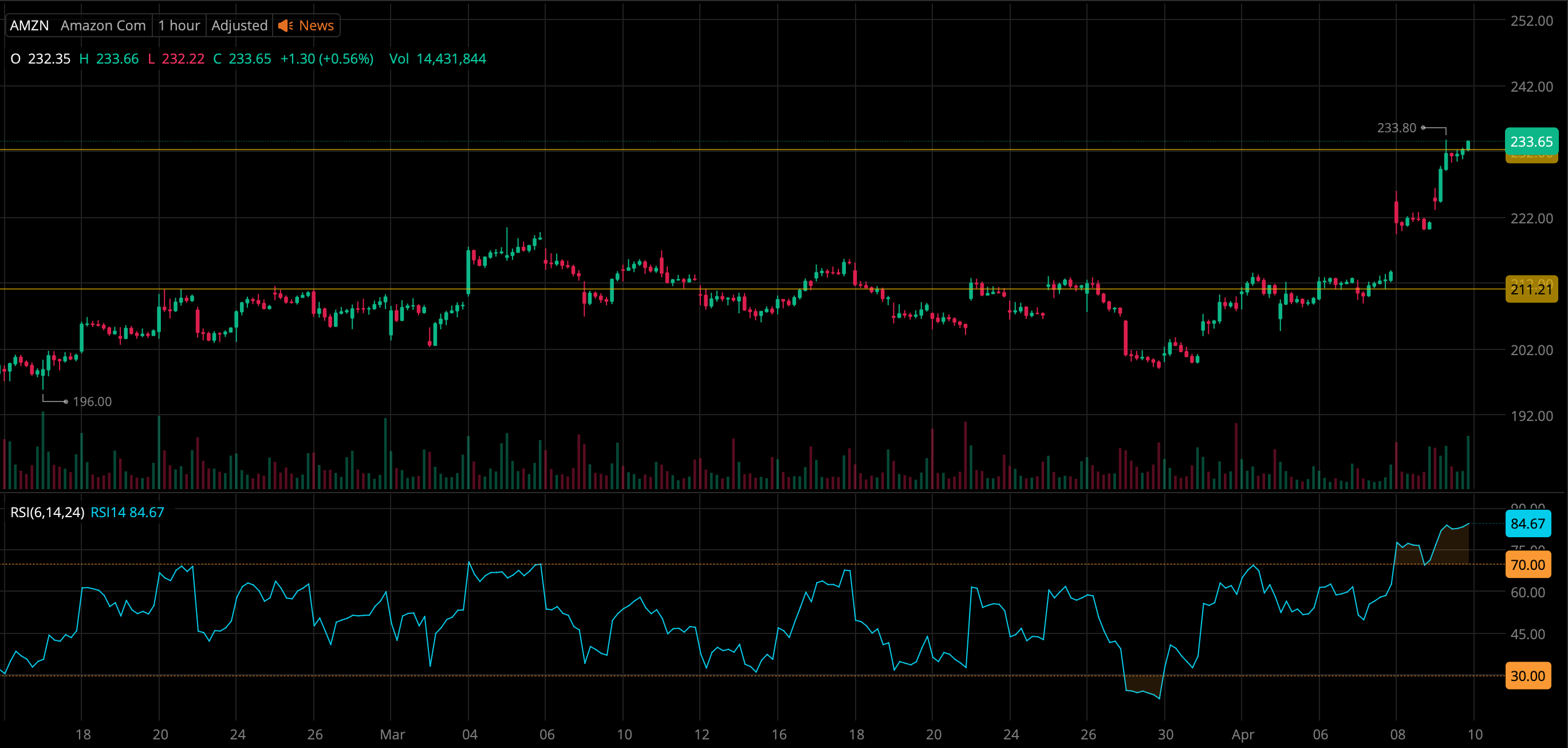 - The last time AMZN was ~$230 was back in early February, and we are now seeing it starting to recover and reach its high again. If the analysis is correct, we can aim for another $12 increase in the next days.