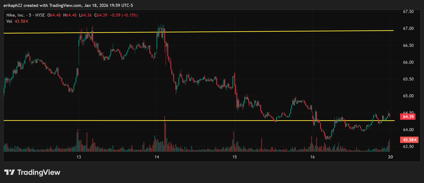 So even though the support changes for the one month in comparison to the three month chart, the resistance remains for the most part unchanged aside from a brief breakout mid December. So, at the moment, without considering volume, I'd say it is a pretty defined channel where low ~$61 and high ~$66. Let's look at the five day chart and consider the volume.