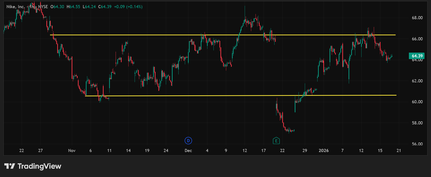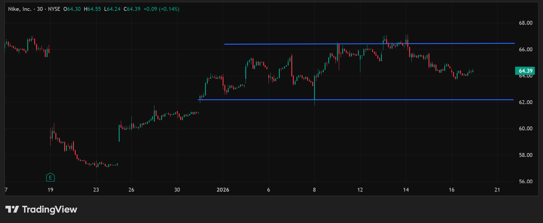 If you recall, we established that in to consider it a valid channel, the upper and lower end of said channel needs to have 4 points, two in the upper band and two in the support area. In the snapshot below for the 1 month timeframe, we can see that the support has been ~$62 and the resistance ~$66. You may notice I focused on the latest days as prior to then, December 17 – December 30, the price between high and low is extreme and a channel is not clearly defined.