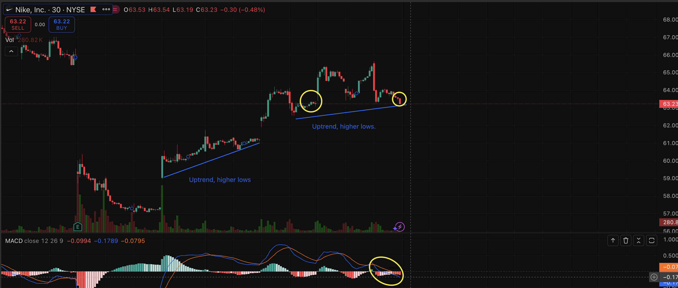 In the chart above, we can see the divergence twice as an uptrend. We know this to be true as there are higher lows. At the same time, the MACD has crossed the signal line below it which may mean a shift and a downtrend. However, because there is a bit of an uptrend, we could say that there will be a recovery and the momentum will shift upwards. Again, a positive divergence tends to be observed when the stock reaches low prices, but the indicator (RSI or MACD) reach higher lows, this is where a price reversal may occur and go upwards.