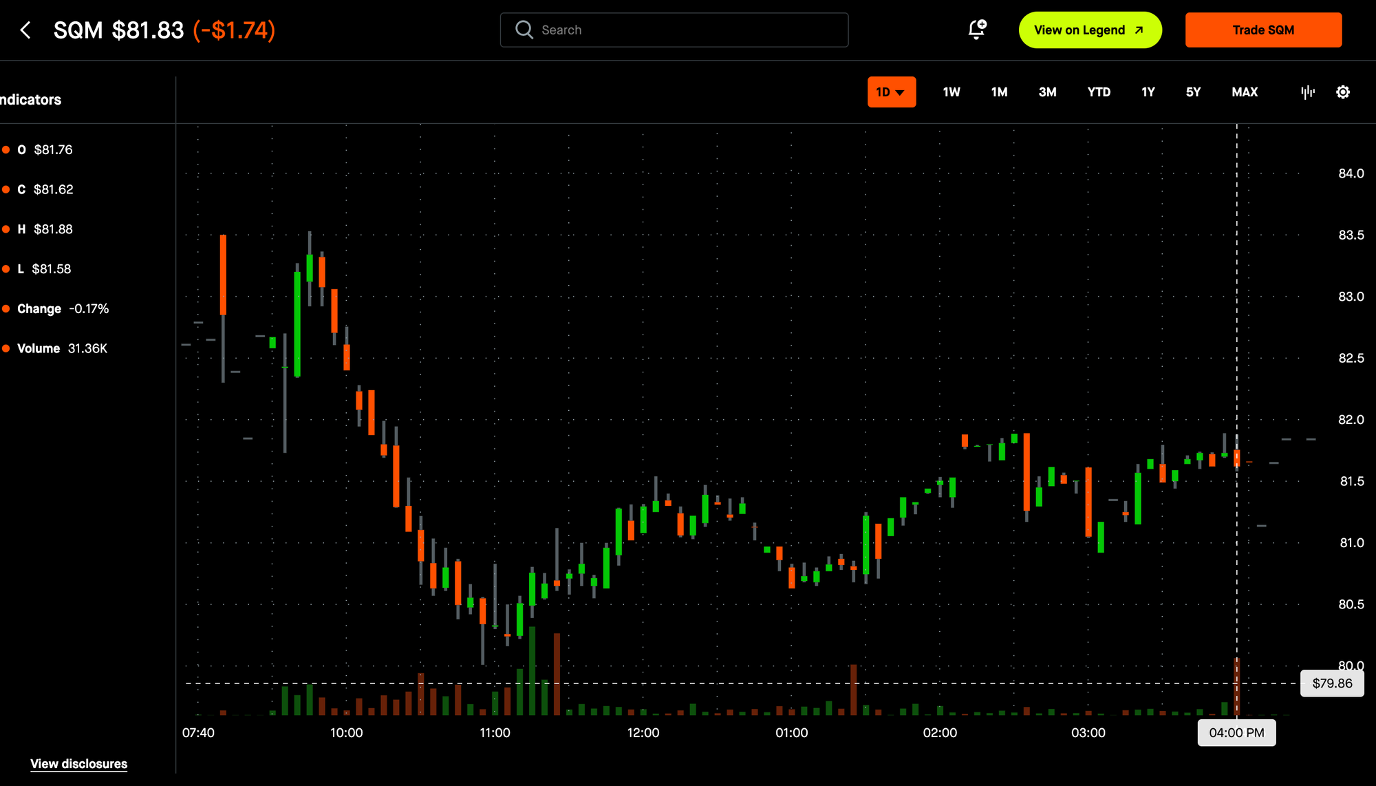I lost more than I intended as the order fulfilled at $1.04 and not $1.80. I don't love this, but as predicted, the stock kept going down during the day and it even closed at $81.83 with a high selling volume, see screenshot of today's chart below: