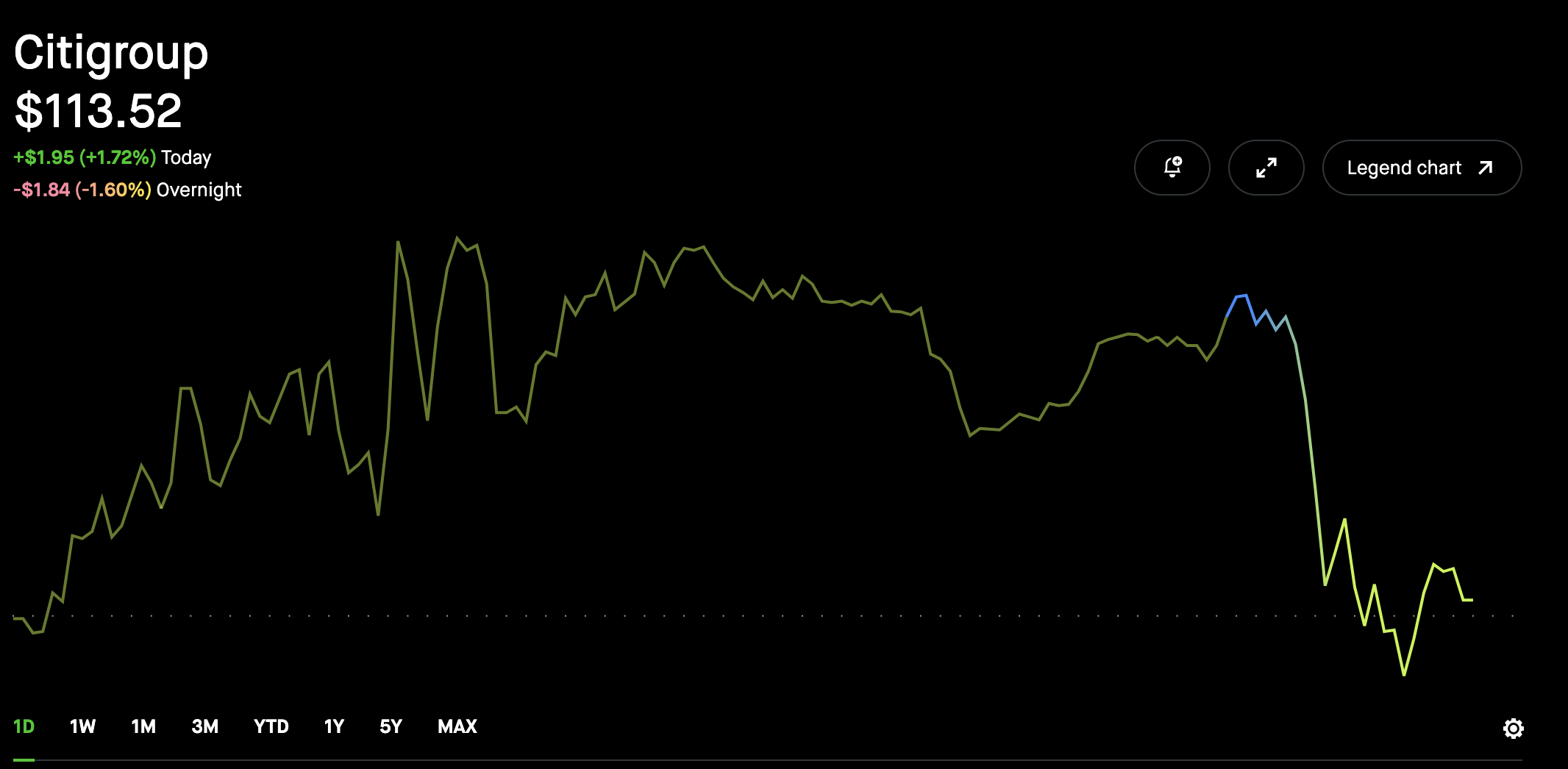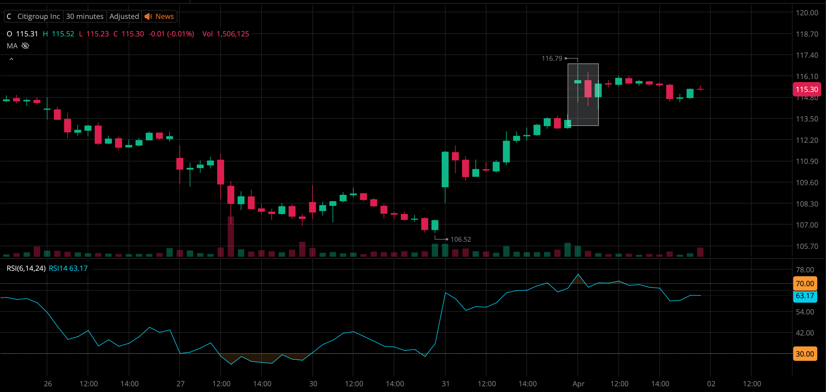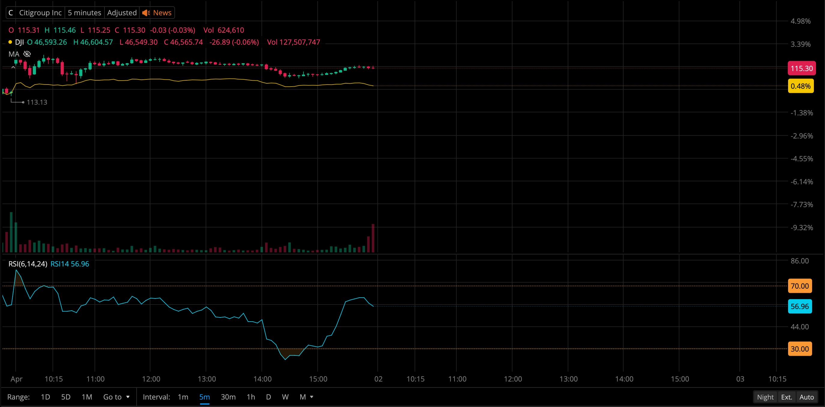 Overall, Citigroup isn't doing terrible in comparison to SPY and DIA (DJI), which is a very strong signal. However, it may mean that the drop might either not be too drastic or it may be slow to drop to $108
