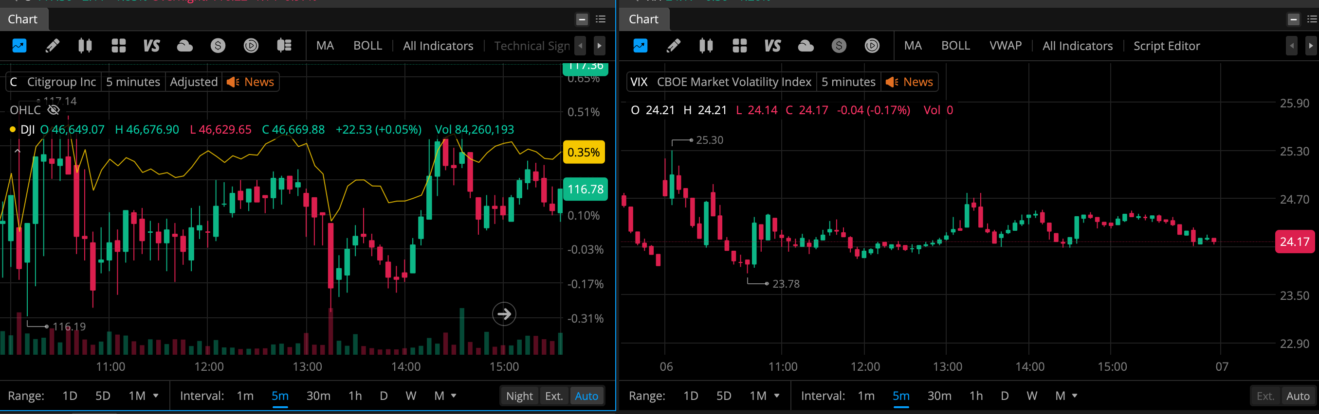 On the left hand chart, we have Citigroup's performance against DJI, where it is evident that C outperformed DJI today. At the same time, DJI in general was ~0.35-.36%% up today.