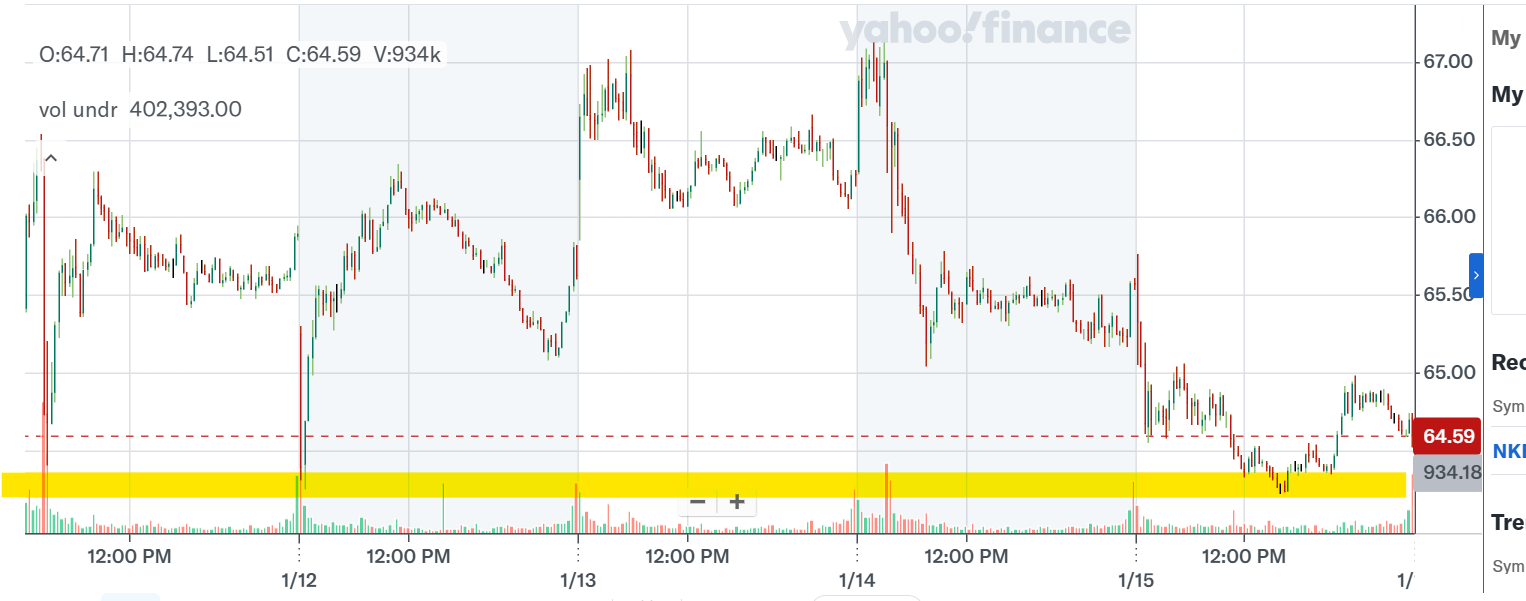 $NKE Call Option $66 expiring on January 23. On January 15, the performance was as followed: Open $65.76 & Close $64.59