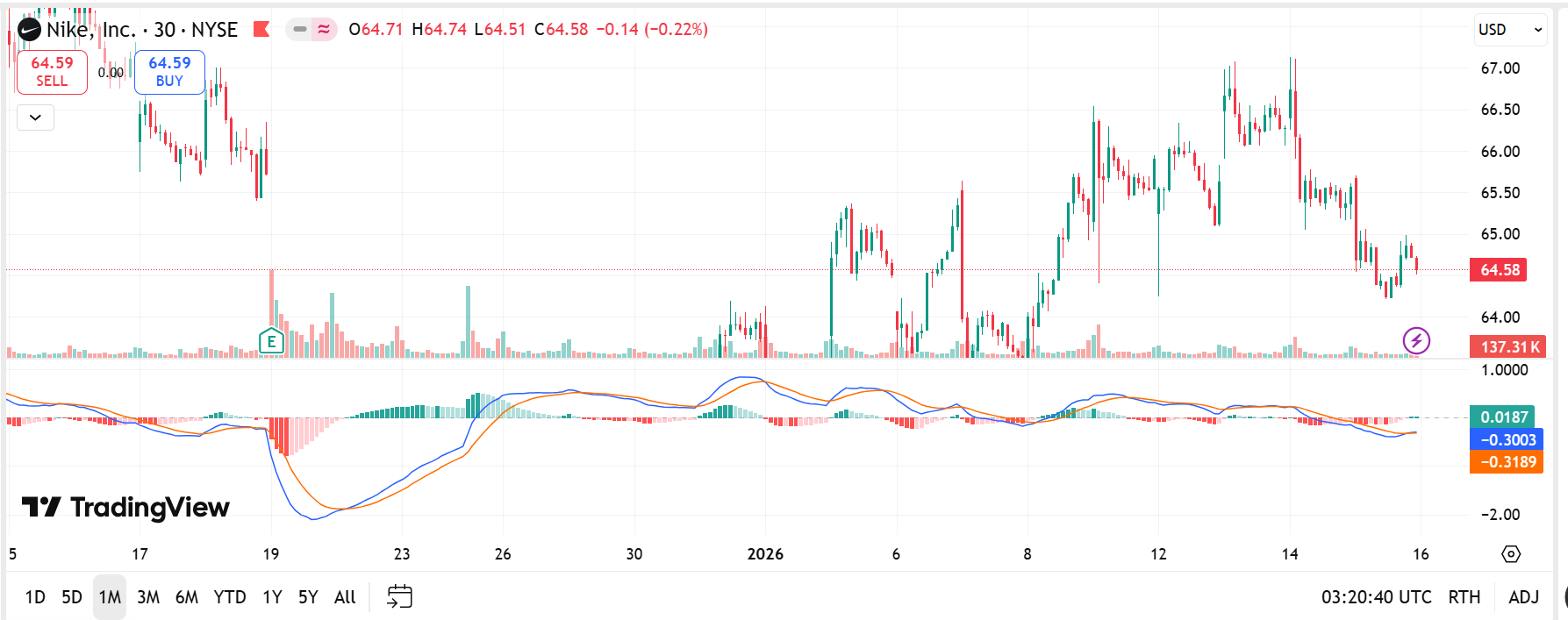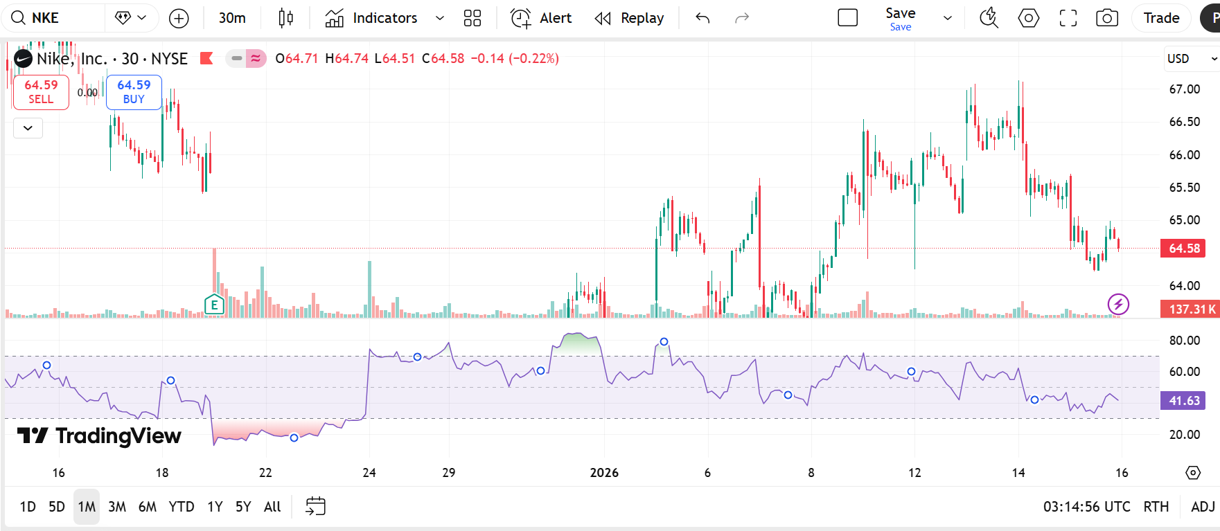 In the last three blog posts I've covered the three candlestick patterns: Inside bar, engulfing pattern, and pin bar. While I've gotten a good understanding of each one of them and have used it for my open contract, today I want to cover the $NKE's performance on January 15, 2026 and want to use the three setups plus RSI and MACD to get a good understanding. However, I don't plan on using all the techniques when I start trading more.