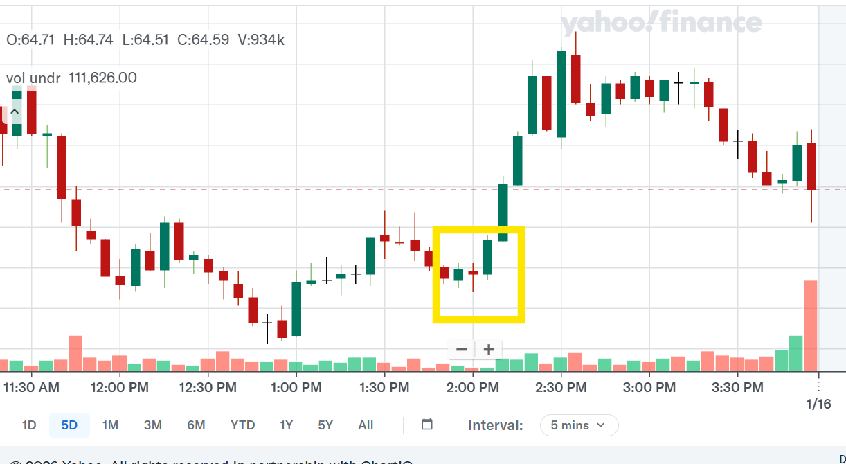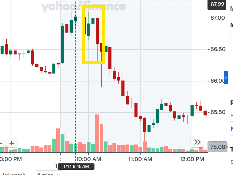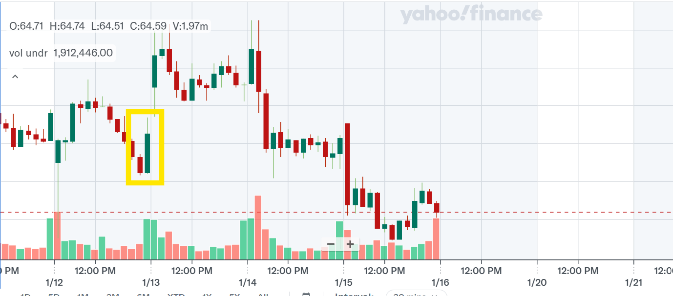 If we look at the zoomed in version of $NKE for January 14, we can notably tell that a bearish moment was approaching on January 15. I've highlighted the engulfing moment when it opened on the the 14th. At the same time, if I look at 5 days worth of price data, I can see that there is a support for ~$64.20 so I want to believe that it will not go lower than that. See the support highlighted below: