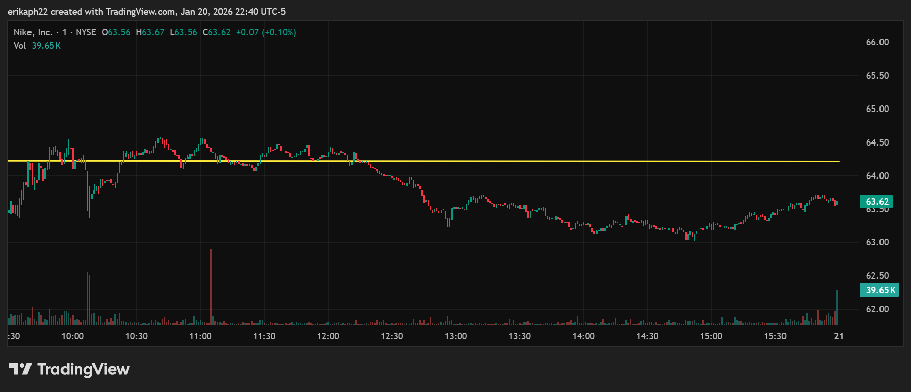 Two posts ago, I wrote about channels breakouts and volume, more specifically, I applied it to my open $NKE contract to get a more solid understanding of it. I mentioned that I'd use January 20 to understand if the support breakout observed on January 16 was solid or if it was a fake-out. So, let's look at today's chart using the same established channel and see where it closed.