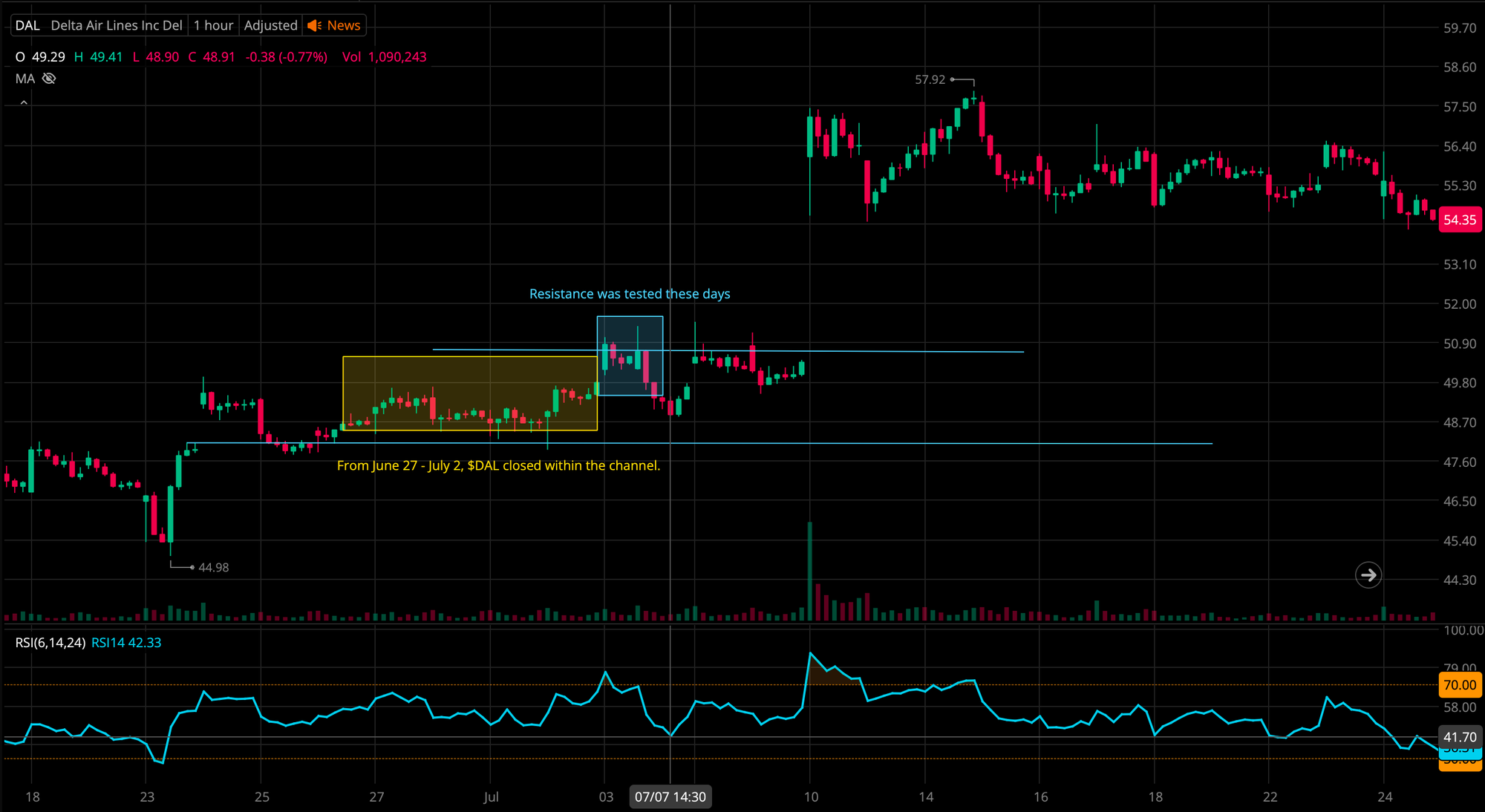 In the above, I have highlighted the define channel, the support of ~$48.20 was tested around June 26, but from June 27 - July 2, we can see that $DAL closed within the channel creating a stable stock price. Resistance was then tested after July 3, and I bought my contract on July 7, after the resistance was tested. At this time, $DAL closed within the original channel, and the volume on this day was 1M. I've added RSI to the chart, on July 7, we can see that RSI was dancing around the 40 mark, while RSI crossed 70 when resistance was first tested on July 3, it wasn't as aggressive. Let's stick with June 25 - July 7, the RSI seems steady. Buying on July 7 was a great investment because: