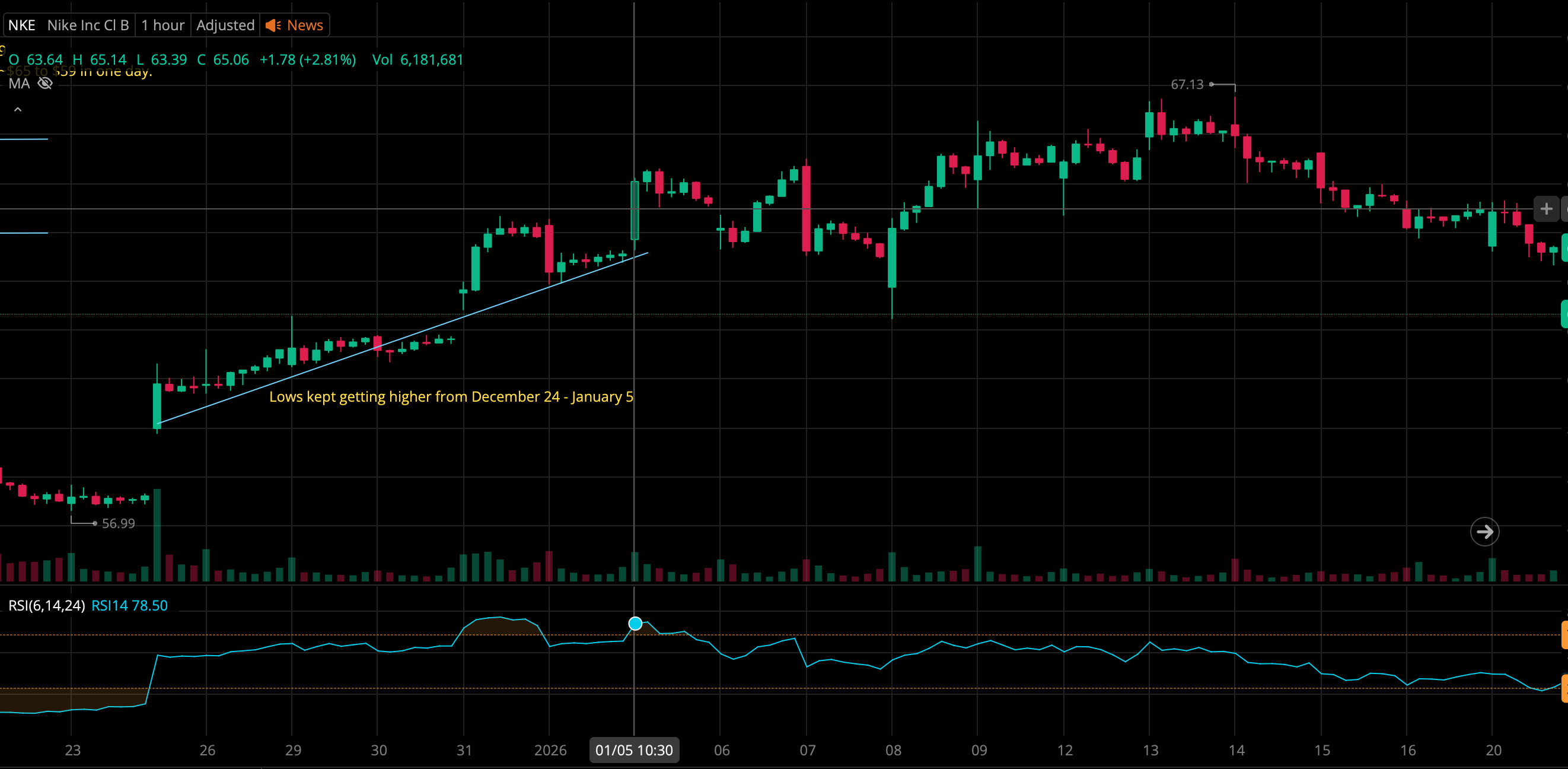 - The lows kept getting higher from December 24 - January 5. I know I haven't covered diagonals in details, but this meant that NKE was on a postivie trend, the price was bound to keep climbing up