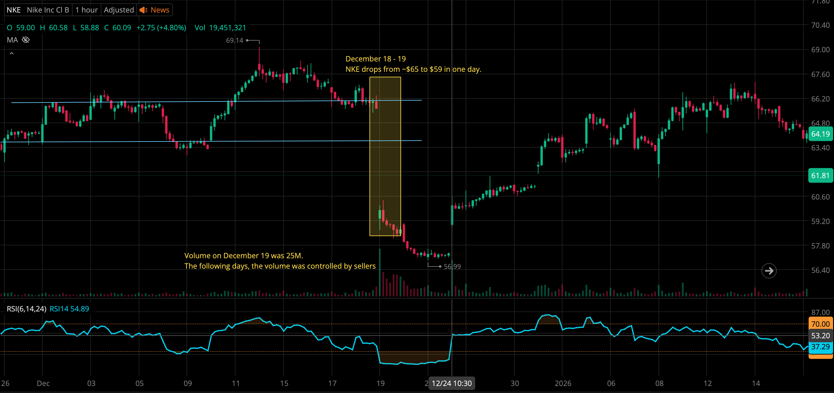 - I've highlighted the significant drop from December 18 - December 19, a $6 change in one day. This is when there was an earnings call, where the earnings per share exceeded expectations, but the sales in China (biggest market for NKE) dropped by 17%