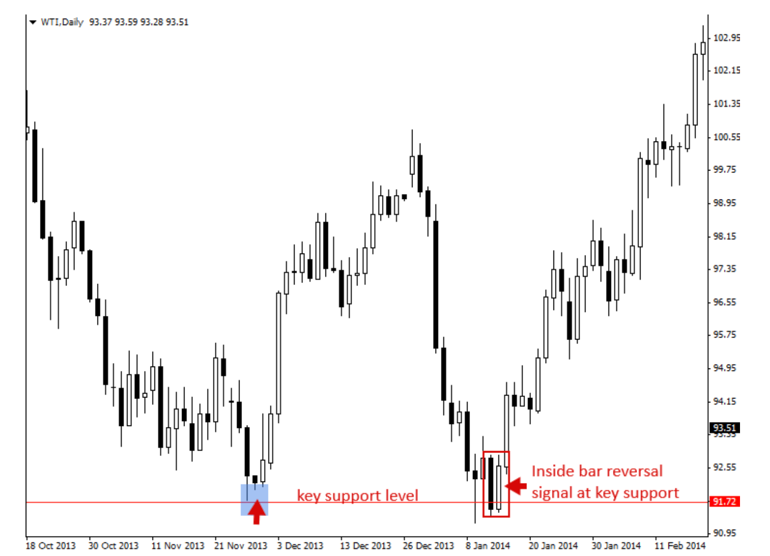 As you see, there is a trend reversal on January 9, where the inside bar is smaller than the mother bar. While the support is not obvious, we see it at play.