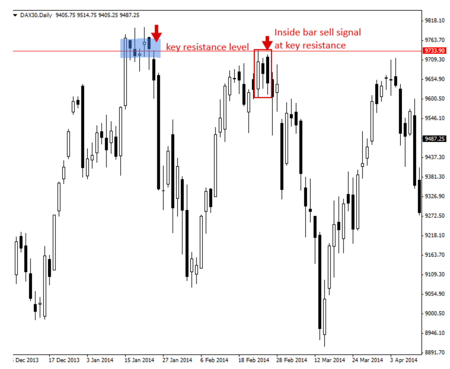 Self explanatory, the inside bar is shown at the resistance level, which signals trend reversal and would be suggested to sell or place put option contract.