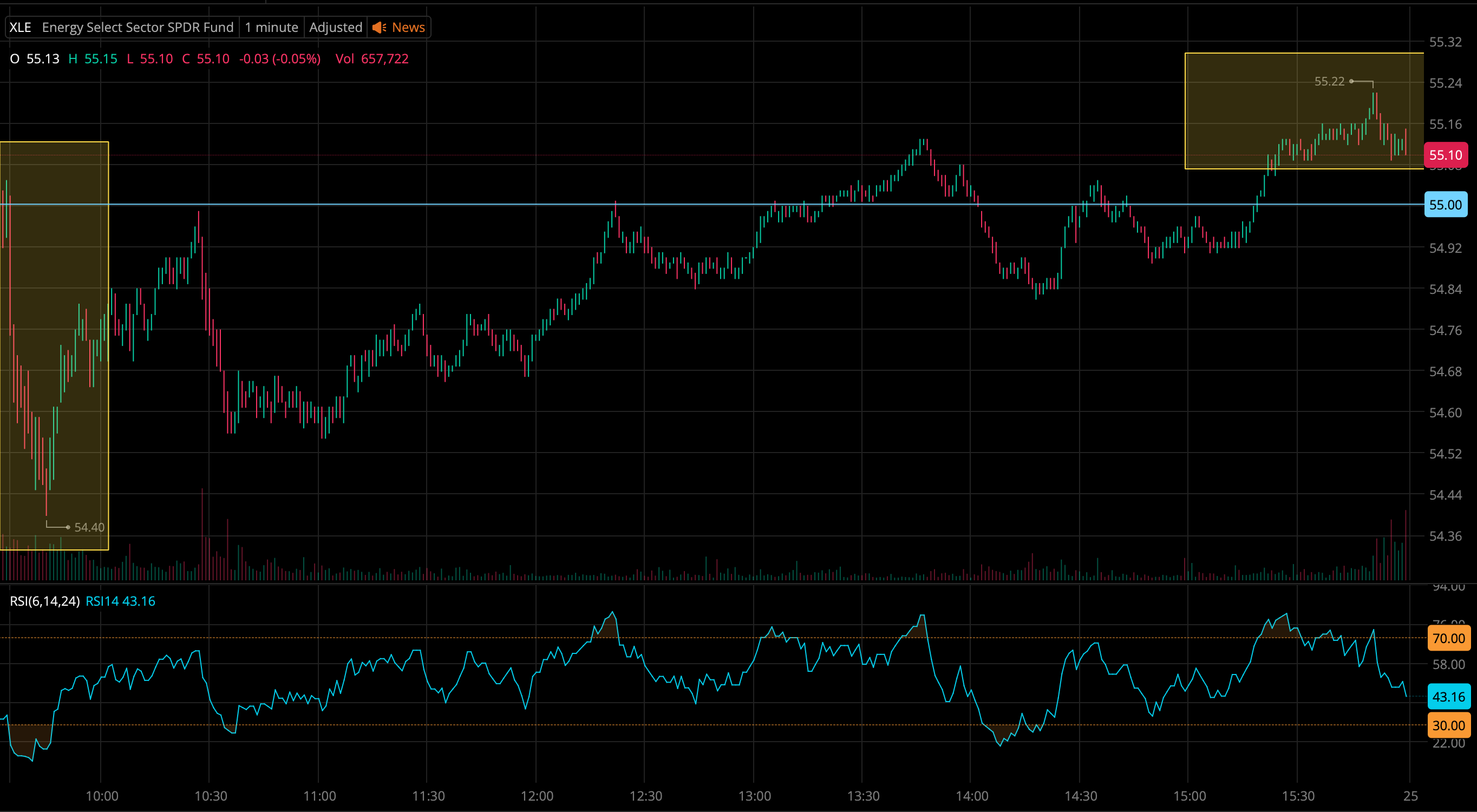 I'm gonna be honest, I pulled out the contract because I panic sold, I exited in between my meetings when I saw the price go down to $54.40 and didn't even give it a chance to recover. I did this because my contract had gone down to $0.90 which was still positive from my bought in price $0.67, I just didn't want to risk it going lower. In the chart below I've highlighted the drop observed before 10:00 am and the closing price above the resistance defined. So, the verdict is that XLE did recover.