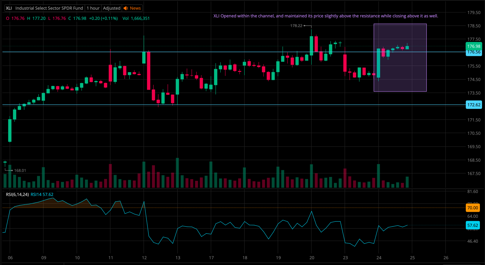 In the above, we can see that today February 24, 2026 – XLI opened within the defined channel but managed to stay above the resistance and even closed above the ceiling. What does this tell me? It tells me the resistance is being tested once again, and it is interesting to me that the RSI remain in the high 50s. We can expect a positive tomorrow for XLI, which then will determine what I do on Thursday. Assuming tomorrow we go even higher and RSI reaches 70 mark, then it will tell me that there will be a slight pull back, in which case, I'll make my entry for a discount like I did for XLE.