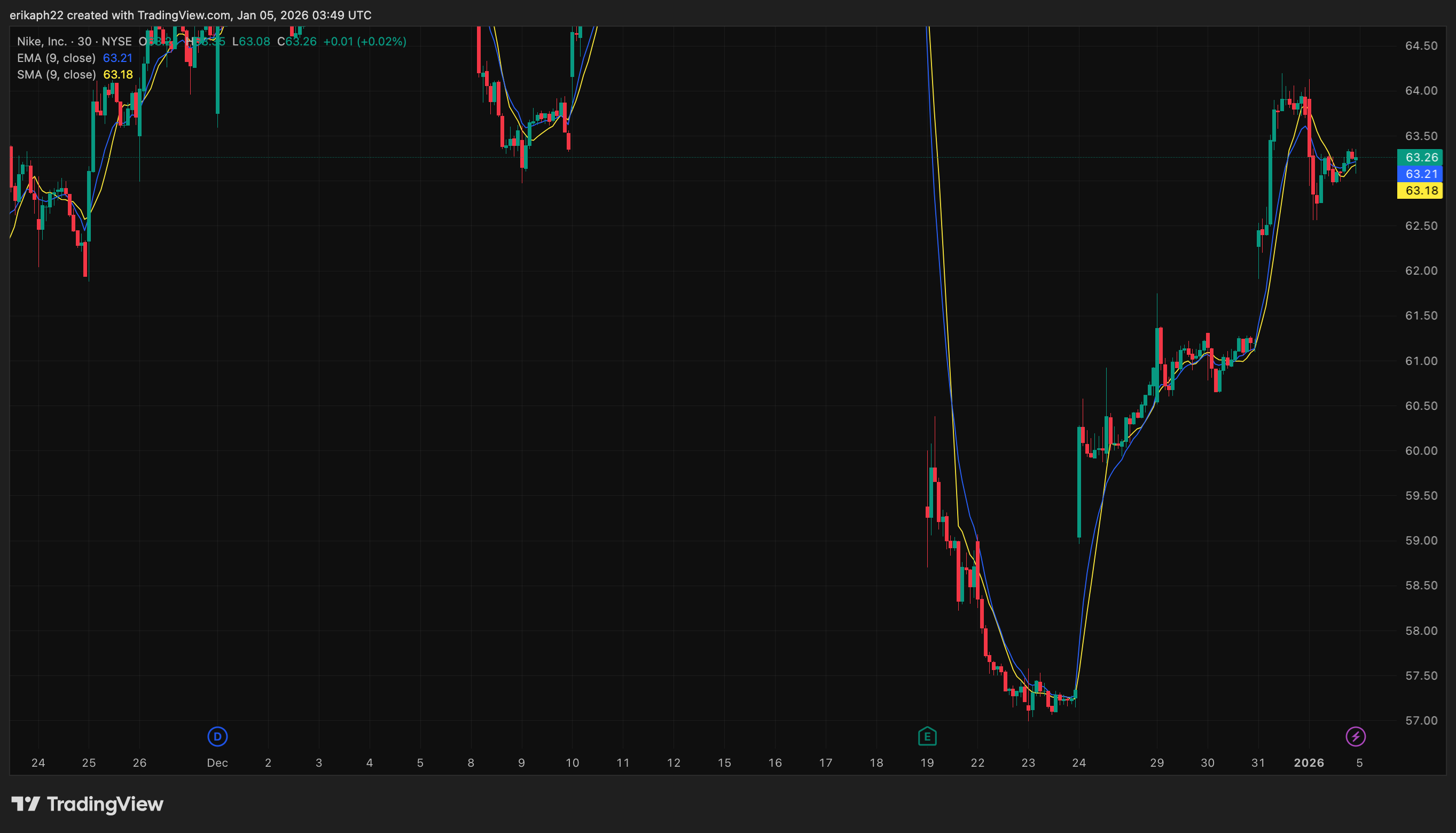 This leads us to EMA = (63.26 - 63.46) * 0.0952 + 63.46 and once this is calculated we obtain our EMA = ~$63.44 which is a bit higher than the one in the chart, but certainly much closer to our previous EMA (63.46). Yes, I am aware that the numbers are slightly different than the ones in the chart, I used TradeView for it and I need to fully understand how it gets computed on that platform. My numbers on the other hand are based of closing prices from December 4, 2025 - January 4, 2026.
