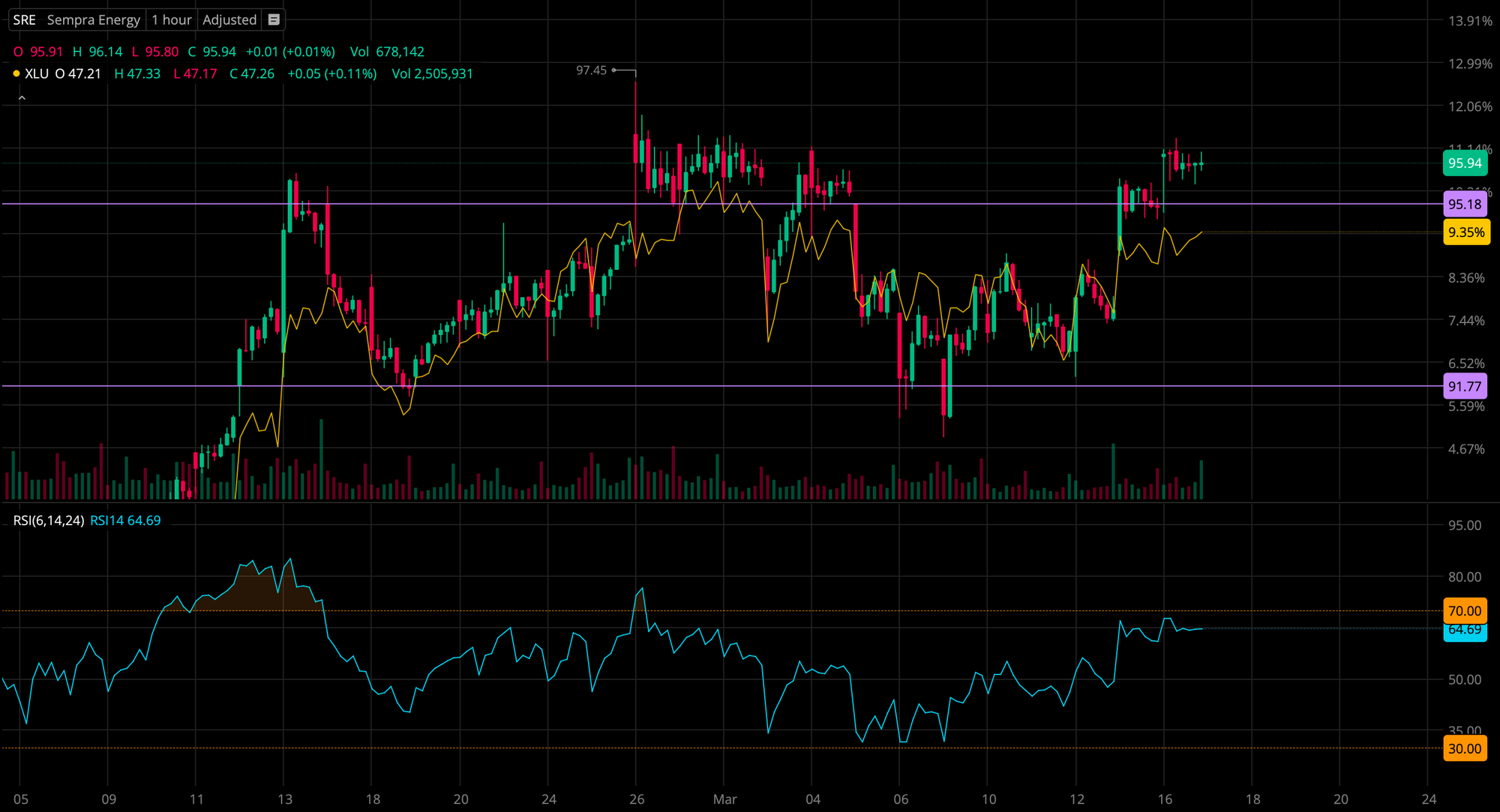 There may be some sellers tomorrow ahead of the PPI, depending on what the general sentiment is. If the majority is expecting the PPI to continue to rise from the previous month, then we may experience a drop in most sectors, but specifically utilities. The opposite can happen, if the PPI is expected to be lower than the previous month, then it can push SRE to $98 before its ex-dividend day on 3/19. While I knew I'd want to exit before the ex-dividend date, the PPI is what's clouding me a little bit.