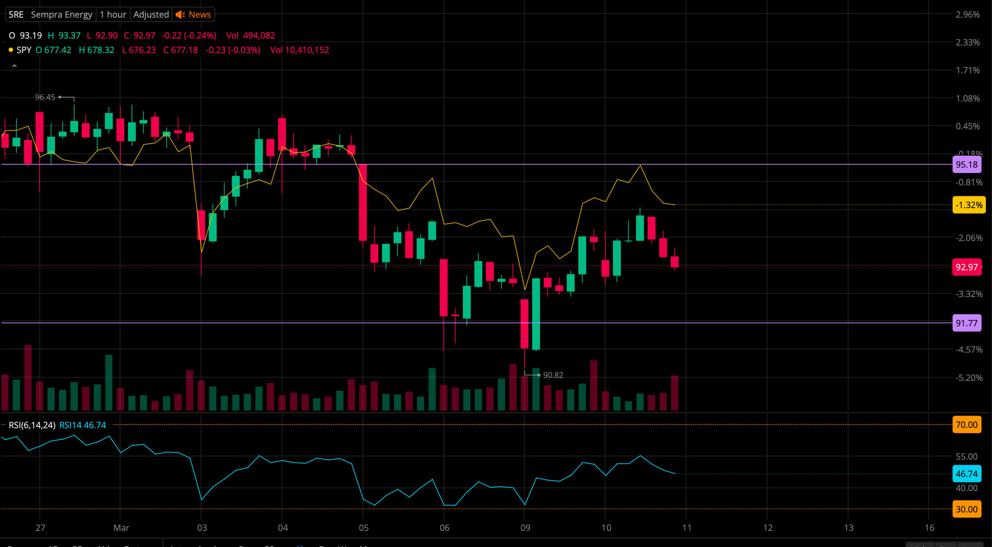 During my analysis yesterday, I looked at the following: RSI, support and resistance for SRE, relative strength against XLU, and relative strength against SPY. These four points allowed me to monitor SRE today and wait after 10 AM to decide whether to enter or not.