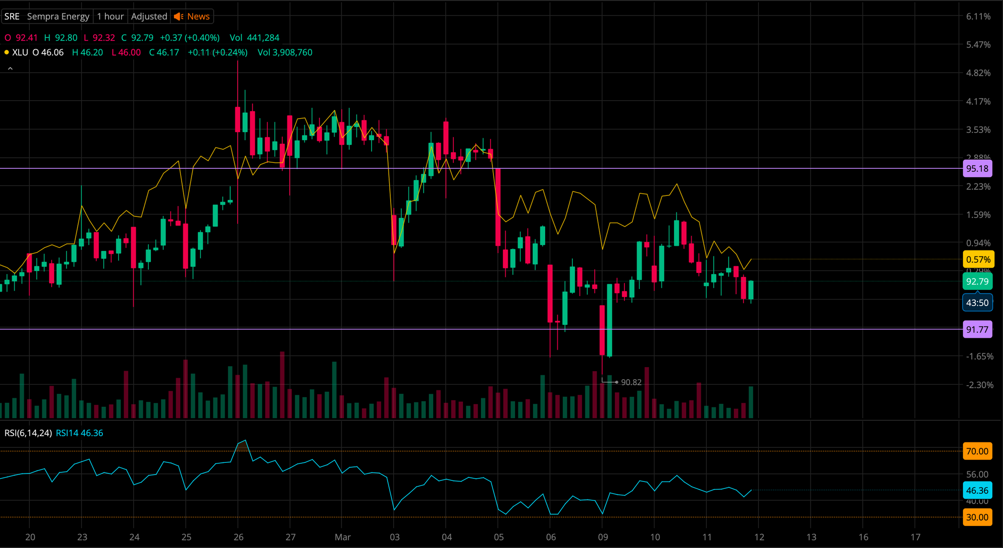 While SRE is closer to the support, I feel comfortable given that I see that tug of war between sellers and buyers taking place. Throughout the day it kept reverting back to $93 range and down to $92 - I saw this happen at least twice today. The RSI remains at a solid 46 mark, which does not make me nervous at all. In addition, we see SRE continues to outperform its entire sector, which says a lot about SRE.