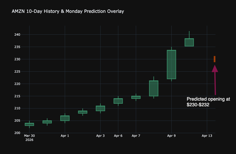 Using the last 10 days worth of data, and more so the observations on Friday pinned with the weekend news, I've predicted an estimated -3.5% opening for Amazon tomorrow Monday.