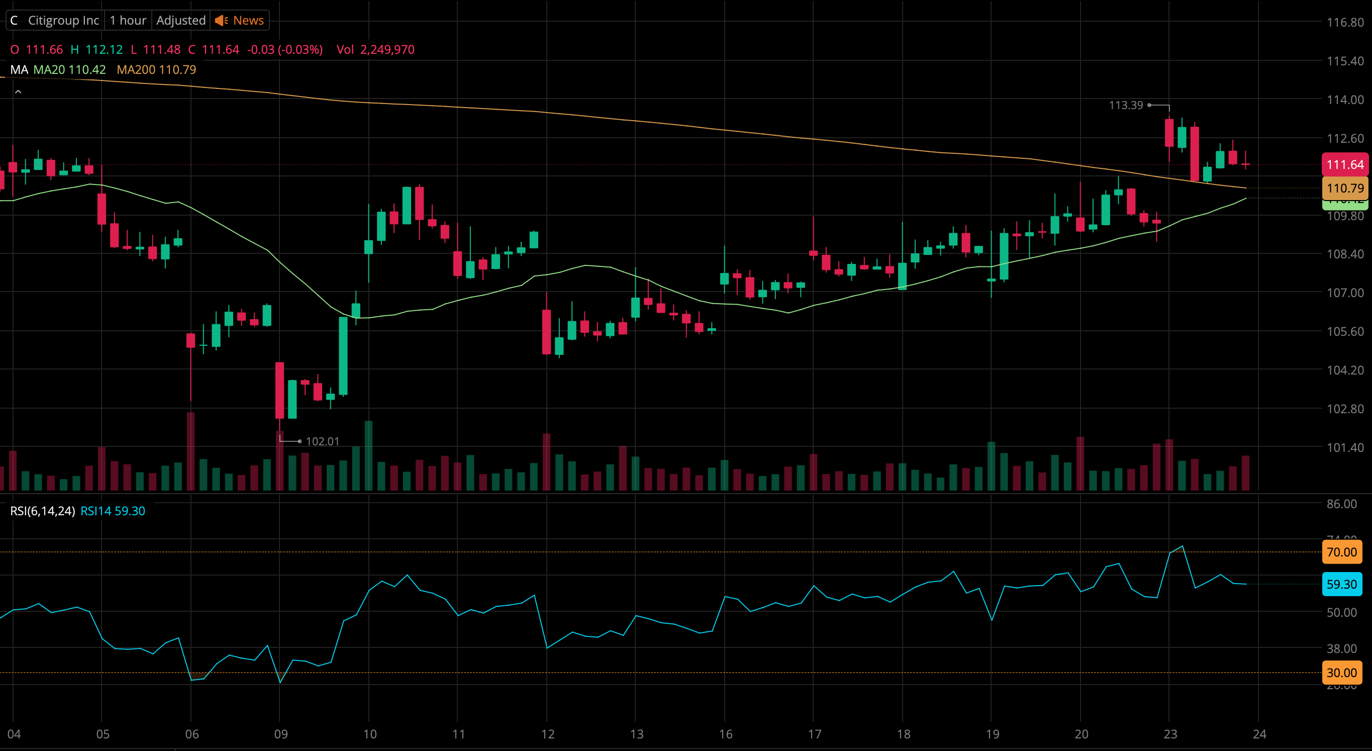 Below we see Citigroup and its closing price being above the 200MA. This is a good thing, it may mean it's bullish. Plus, we saw RSI retract back down to 59 post opening allowing room for another run.