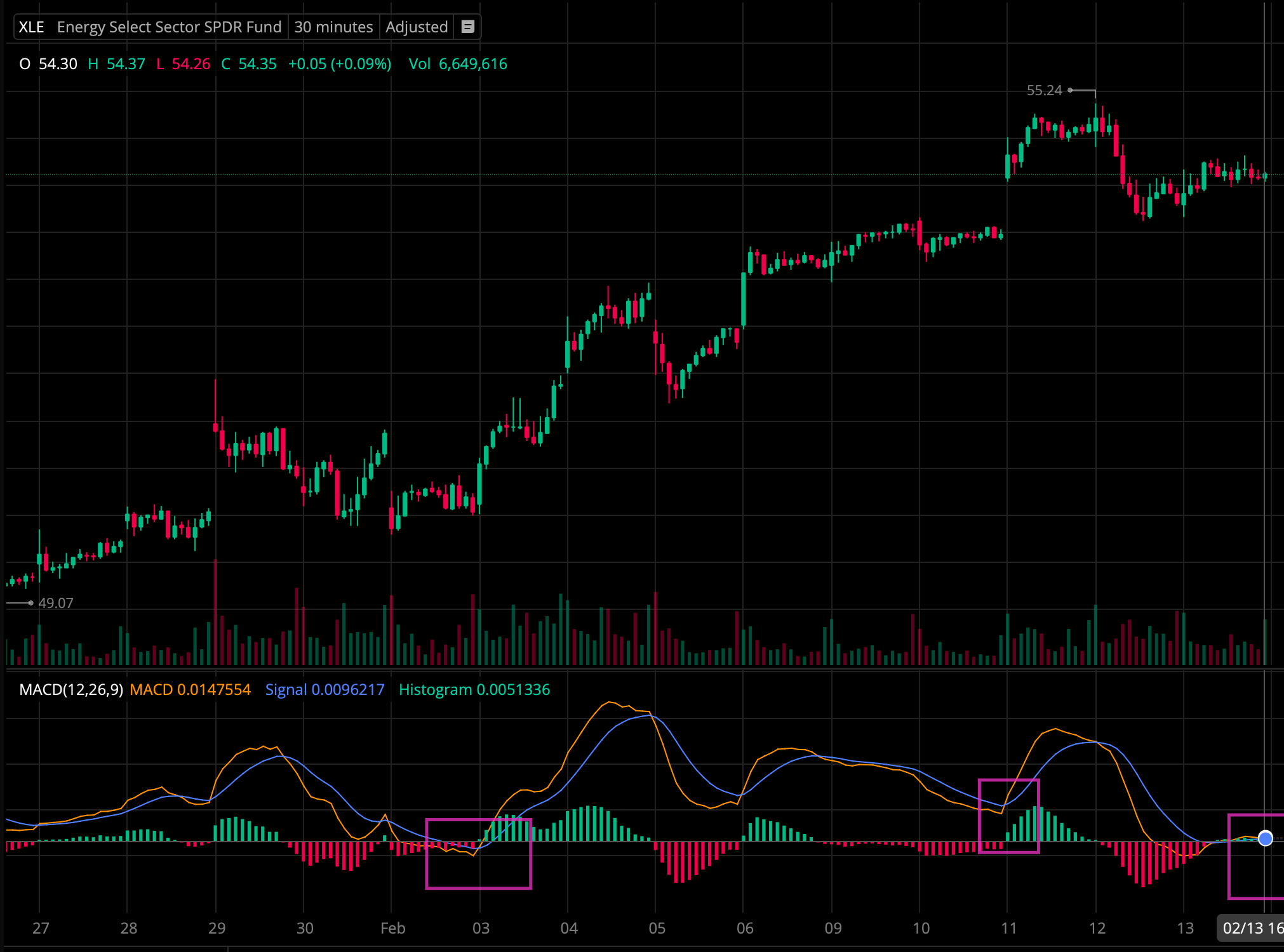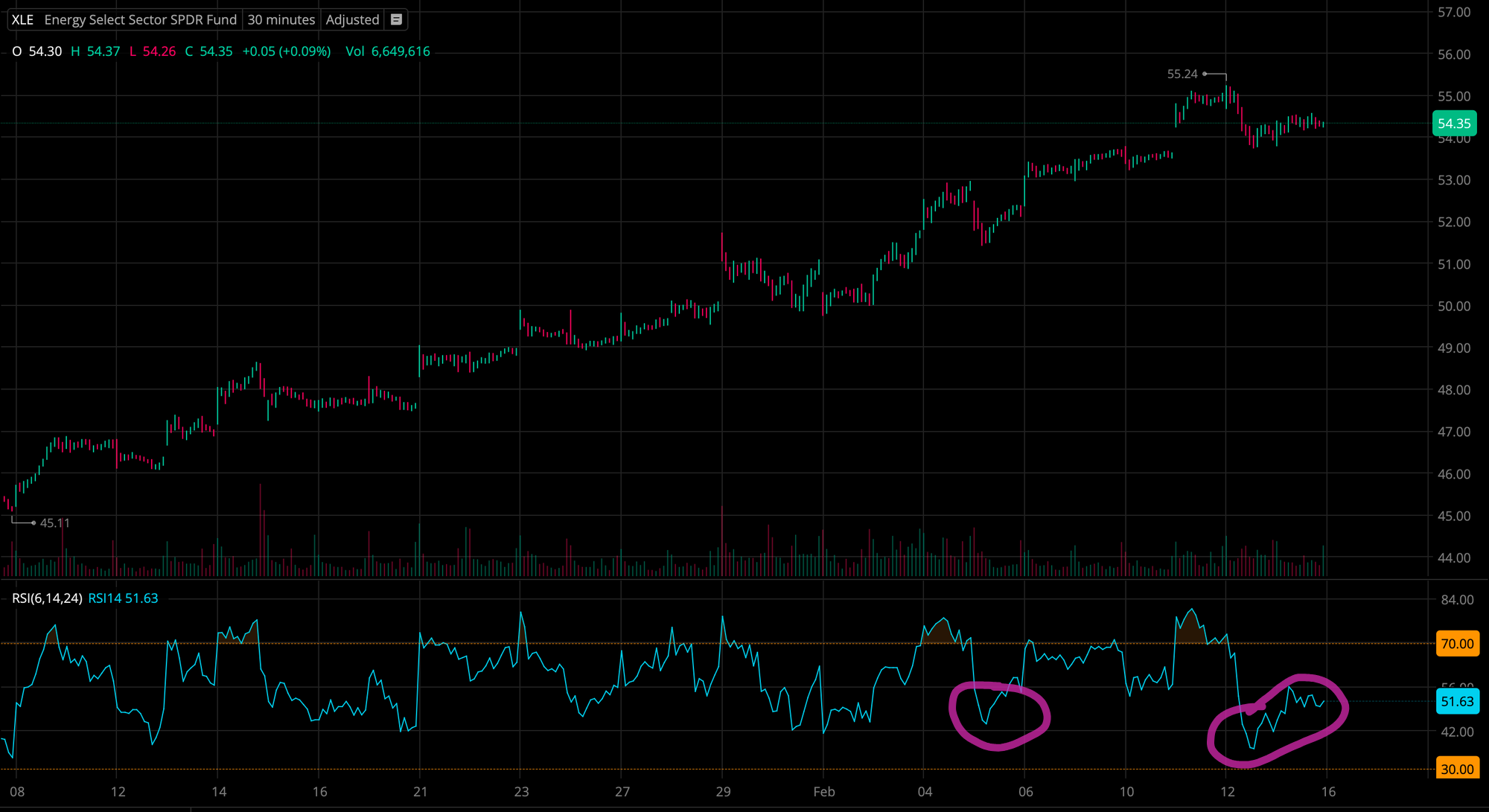 In the above, we're looking at a little over a month's worth of $XLE. As observed, the RSI has crossed the 70 mark consistently where it went above it on February 4, the day before I opened my contract and the pulled back the next day when I entered (see circled). As mentioned, I did freak out a little yesterday when $XLE went down to $53.78 after a high of $55.24 on February 11 where the RSI crossed 70 mark, but we begin to see the RSI re-stabilizing today February 13. What does this mean to me? it means I'm just fine, and we can expect another high early next week.