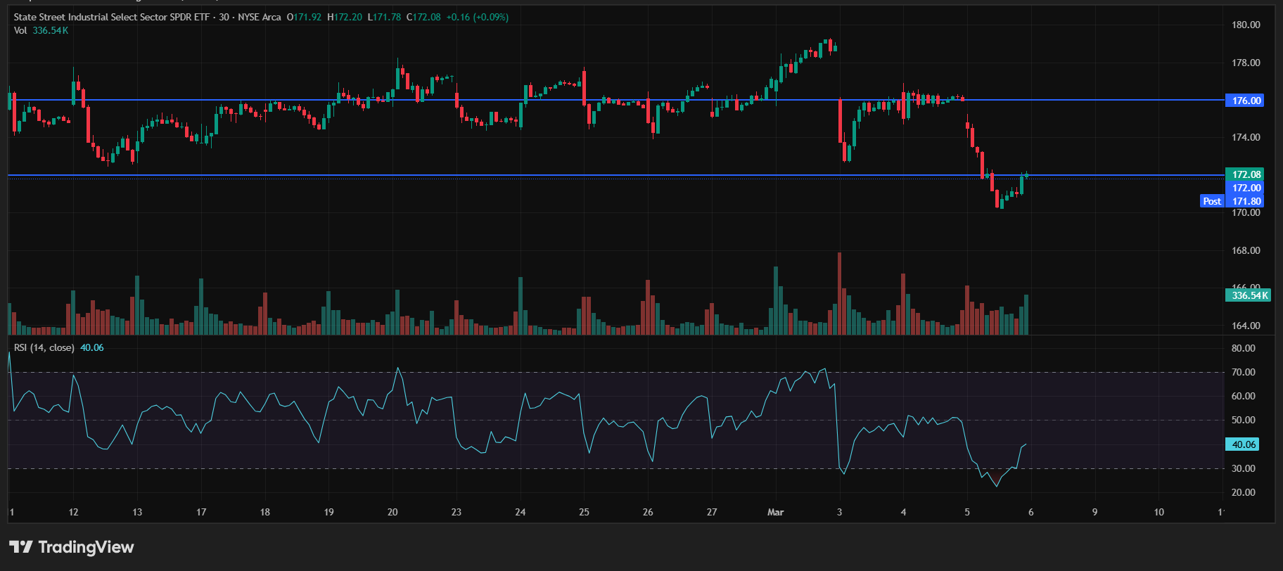 I exited XLI immediately because XLI performed atrociously on March 5, 2026. Not only did it open below the resistance, but it also dropped below the support throughout the day and it barely closed above the $172 support. See below for the performance: