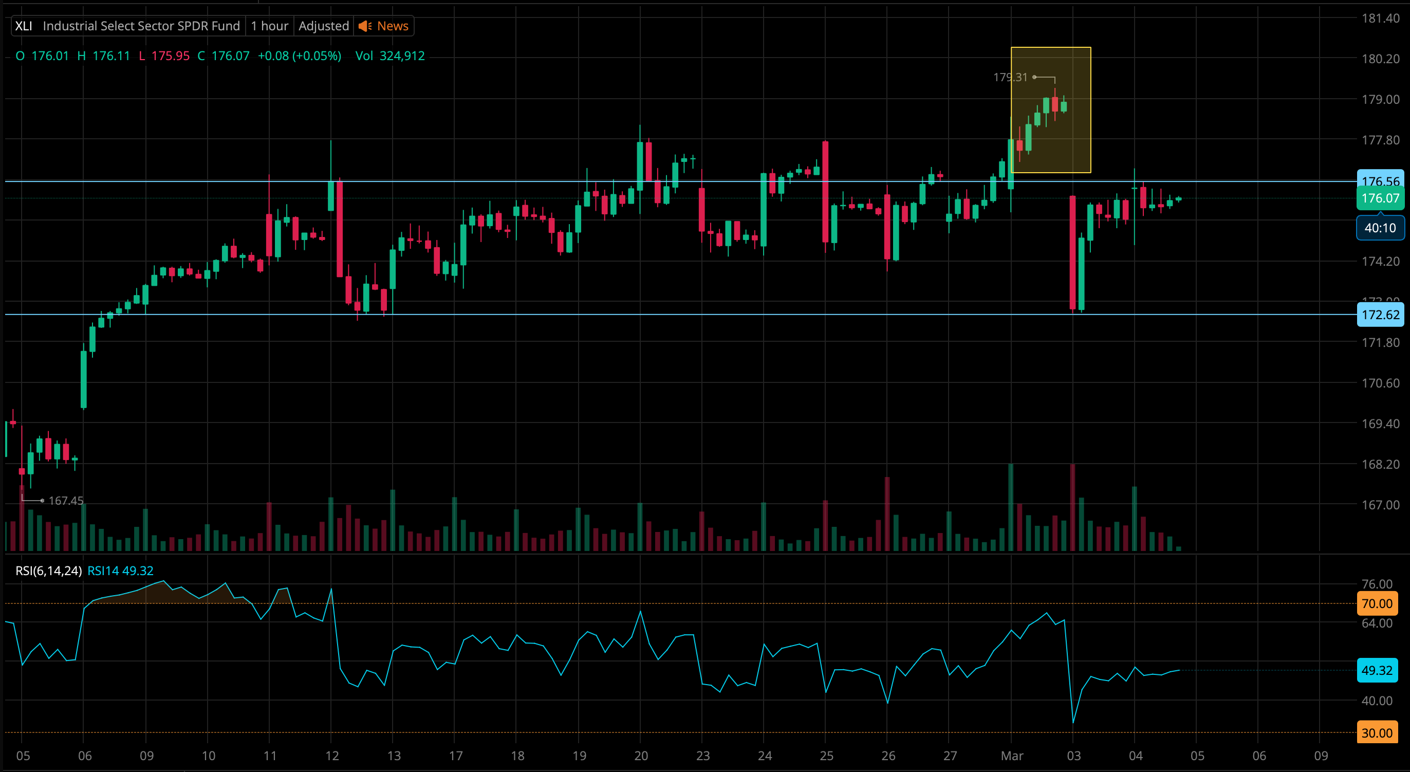 In addition to the above, the reason XLI jumped on March 2, 2026 is partially due to the ISM Manufacturing PMI, which was at 52% indicating expansion. For this reason, many investors jumped in. This jump was short lived, as we see, it immediately dropped down to the original set support of $172.